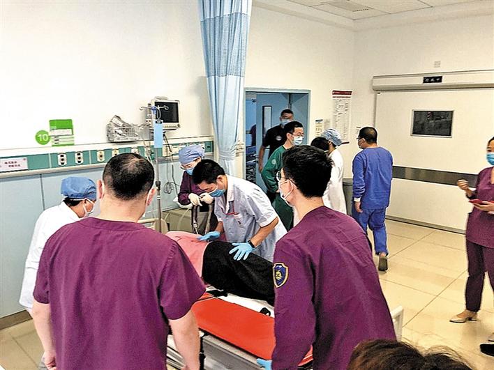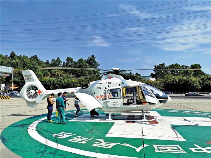 从上机起飞,到在中山七院停机落地,仅花了10分钟时间。比开车送到最近的综合医院都要快上不少。直升机刚一落地,早已等候在停机坪的医务人员准备好了担架车,将患者送到中山七院急诊,进行仔细的检查和稳妥的处置。