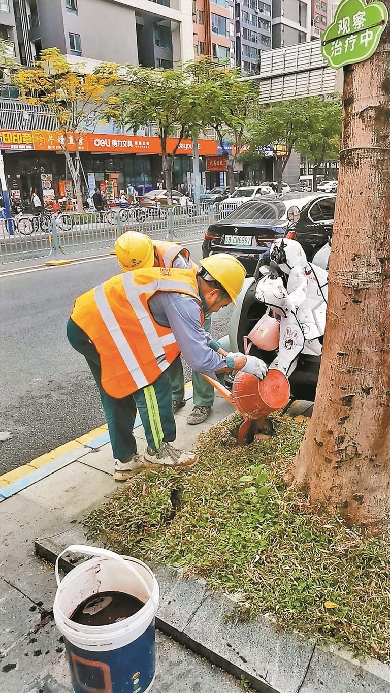 几天后,记者偶遇了现场的养护工人,他们正小心地检查树根周围的土壤。一位养护人员对记者说:“就像人一样,树也会生病,我们正在给它们上药。这两棵凤凰木我们观察好几天了,问题不大。”